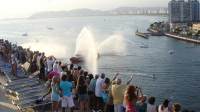 No momento da partida vários helicópteros estavam sobrevoando os navios, filmando, tirando fotos e a cidade simplesmente parada na orla, o sol se pondo, muito lindo!!